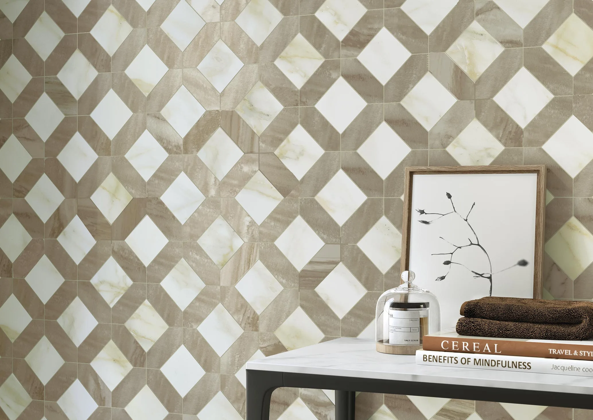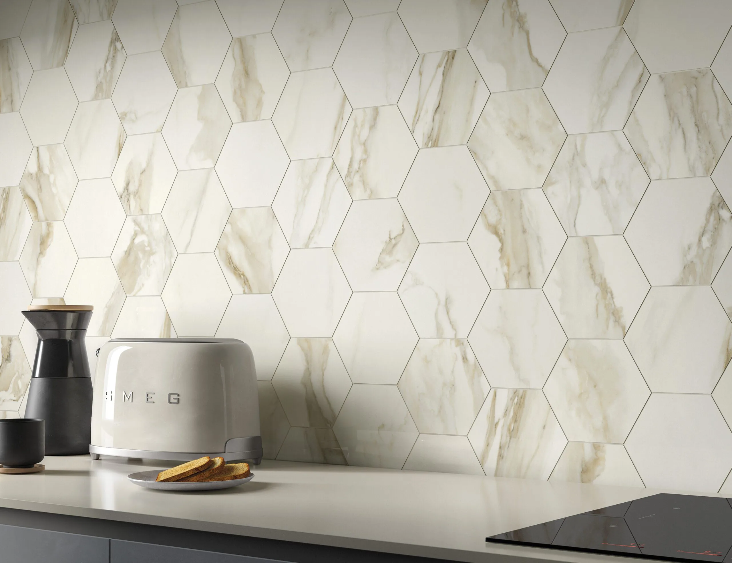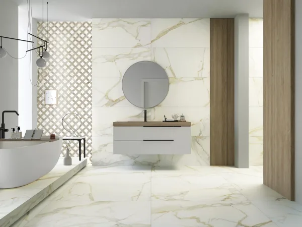 The Amalfi Lux range features soft veining, polished finishes, and subtle tonal variations that create a sophisticated, high-end look. Designed for both wall and floor use, these tiles add depth, light, and a touch of Mediterranean charm to any interior.