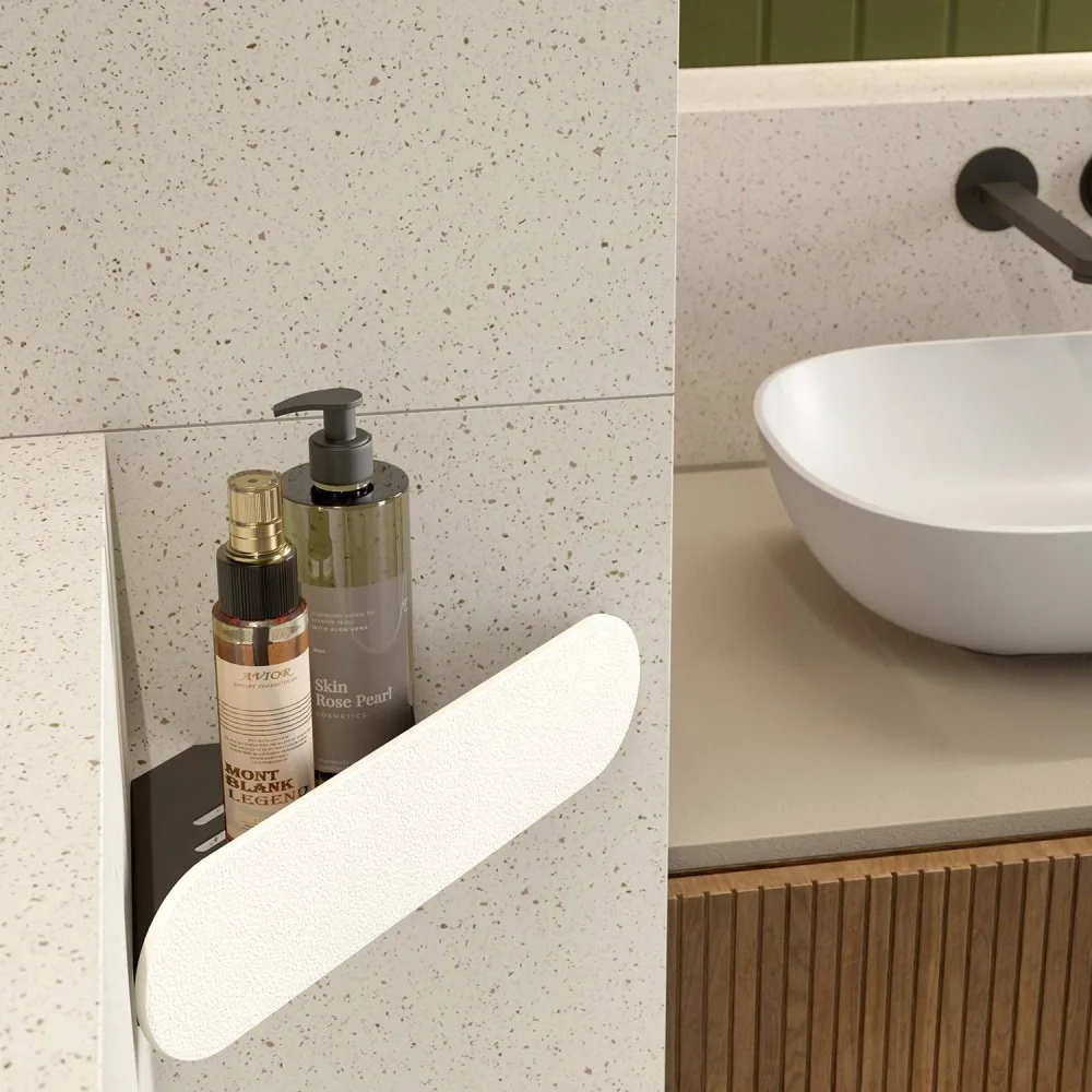 With its floating design, the Box Shelf 1 seamlessly integrates into contemporary interiors, creating a visual float that enhances the sense of space. Its moisture-resistant surface ensures durability and easy cleaning, making it a functional and stylish addition to modern bathrooms — whether installed beside mirrors, above baths, or as part of a storage centrepiece.