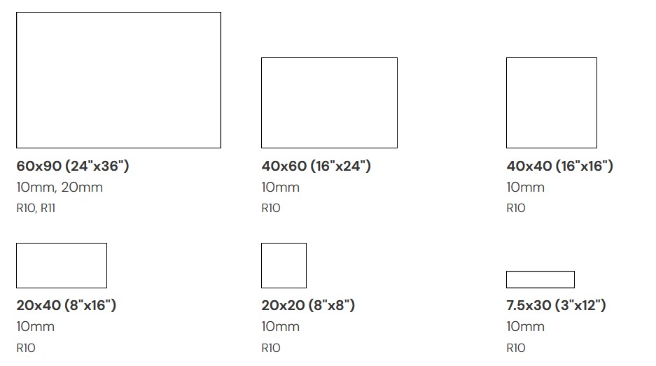 40×60 cm, 40×40 cm, 20×40 cm, 20×20 cm – versatile options for walls and floors.