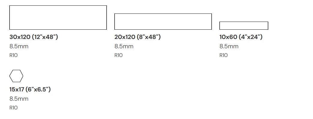 | Size | 10×60 (4"x24") 8.5mm R10, 15×17 (6"x6.5") 8.5mm R10, 20×120 (8"x48") 8.5mm R10, 30×120 (12"x48") 8.5mm R10 |
