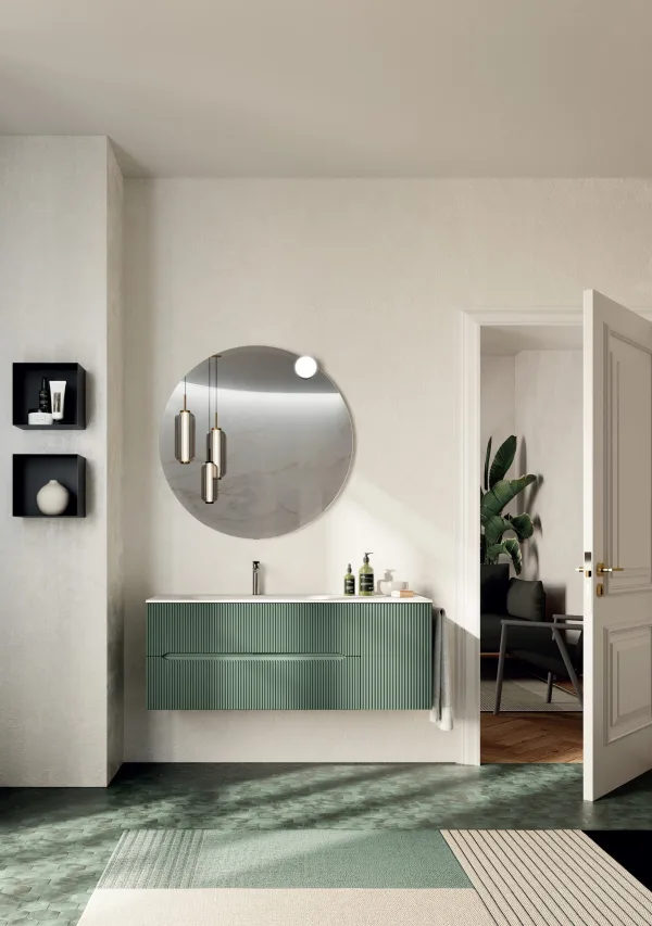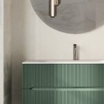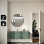 This set combines forest green cabinetry with a double Mineralmarmo basin, round mirror with lamp, and black metal accents for a sleek, modern aesthetic. The towel rail and open-front wall units add practical storage while maintaining a minimalist, contemporary look.