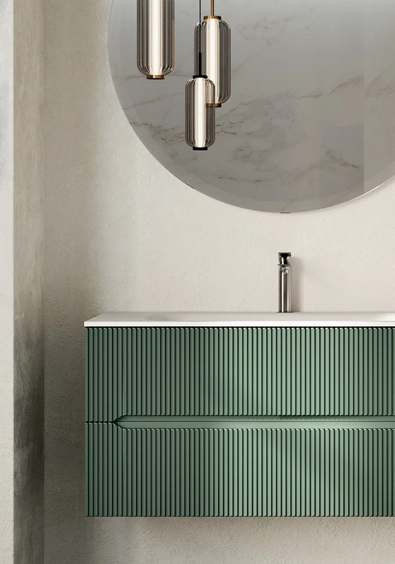 This set combines forest green cabinetry with a double Mineralmarmo basin, round mirror with lamp, and black metal accents for a sleek, modern aesthetic. The towel rail and open-front wall units add practical storage while maintaining a minimalist, contemporary look.