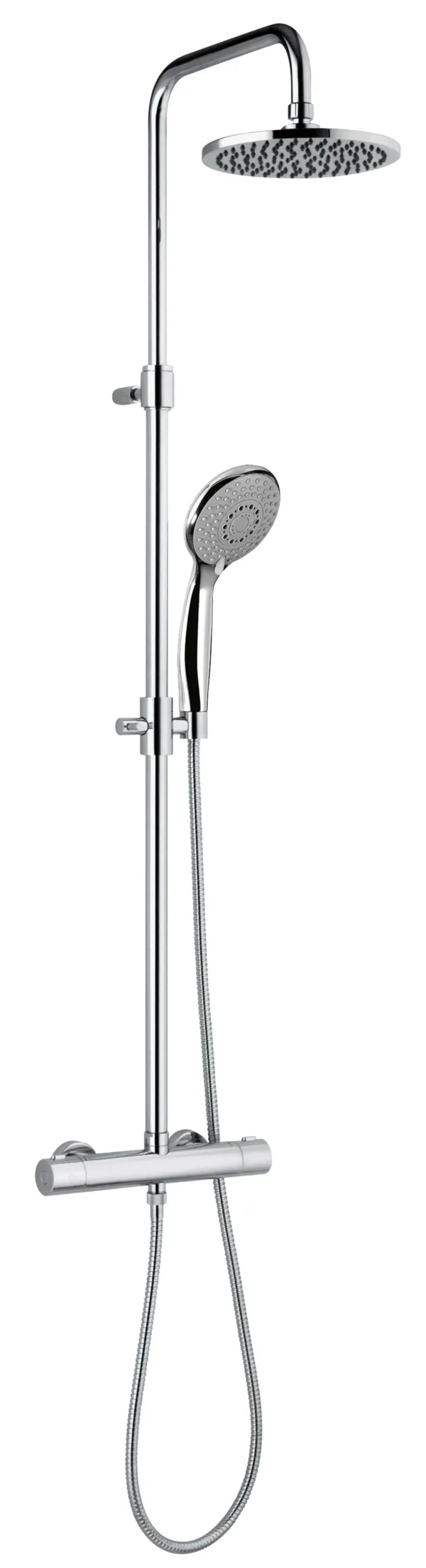 Thermostatic shower mixer with column, shower head and multifunction handshower.