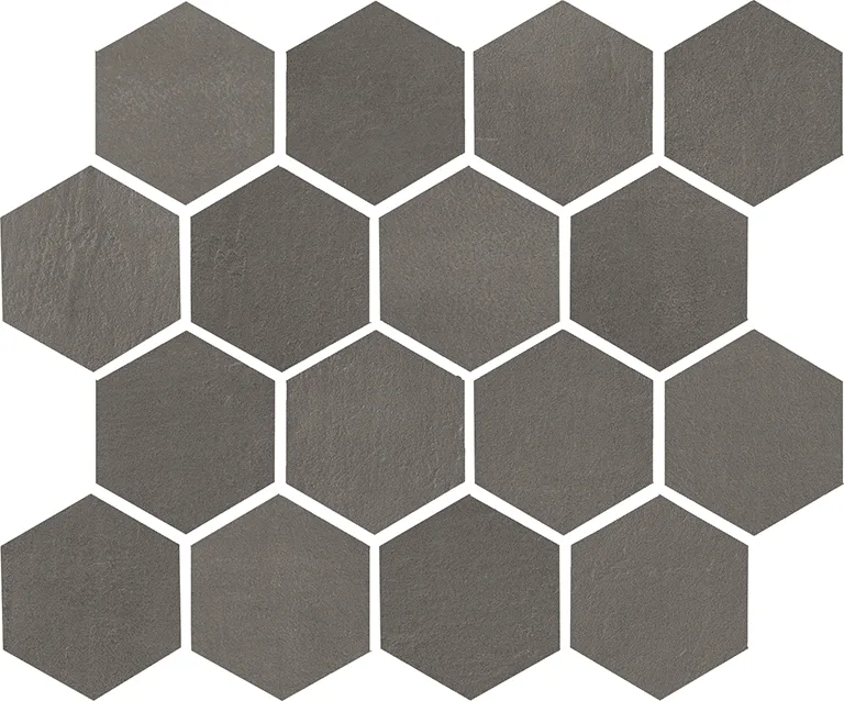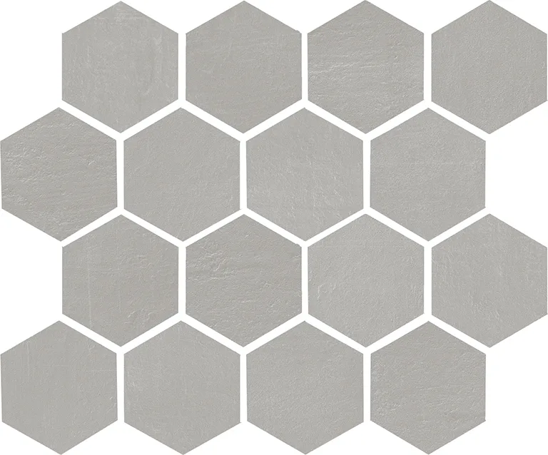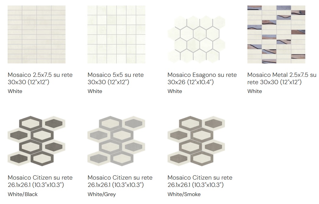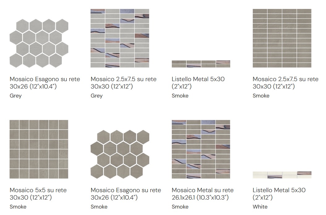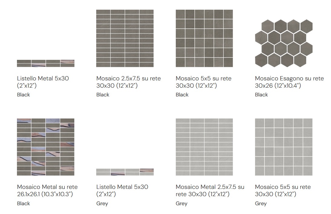 Listello Metal 5×30 (2"x12"), Mosaico 2.5×7.5 su rete 30×30 (12"x12"), Mosaico 5×5 su rete 30×30 (12"x12"), Mosaico Esagono su rete 30×26 (12"x10.4"), Mosaico Metal su rete 26.1×26.1 (10.3"x10.3")