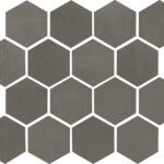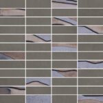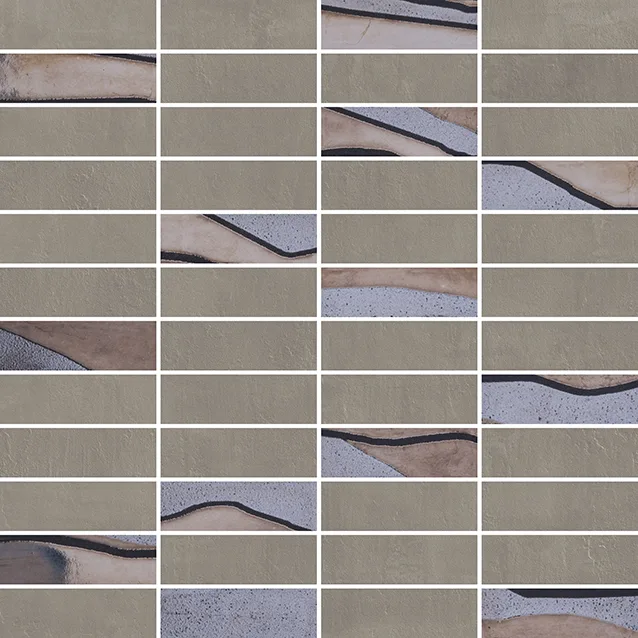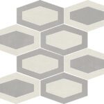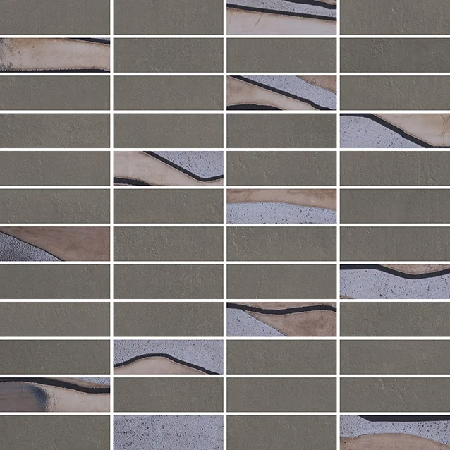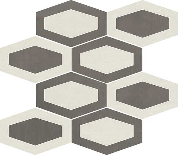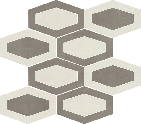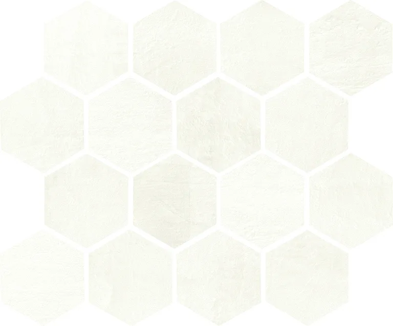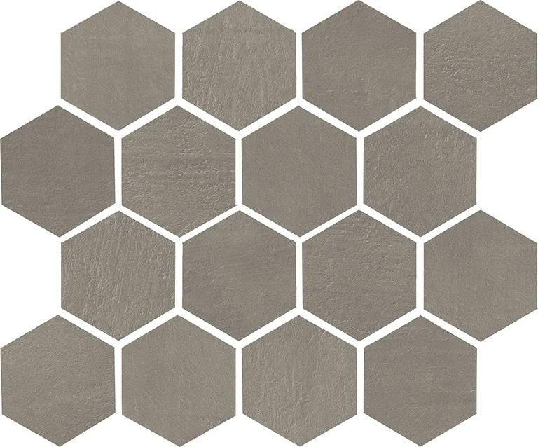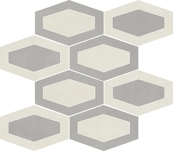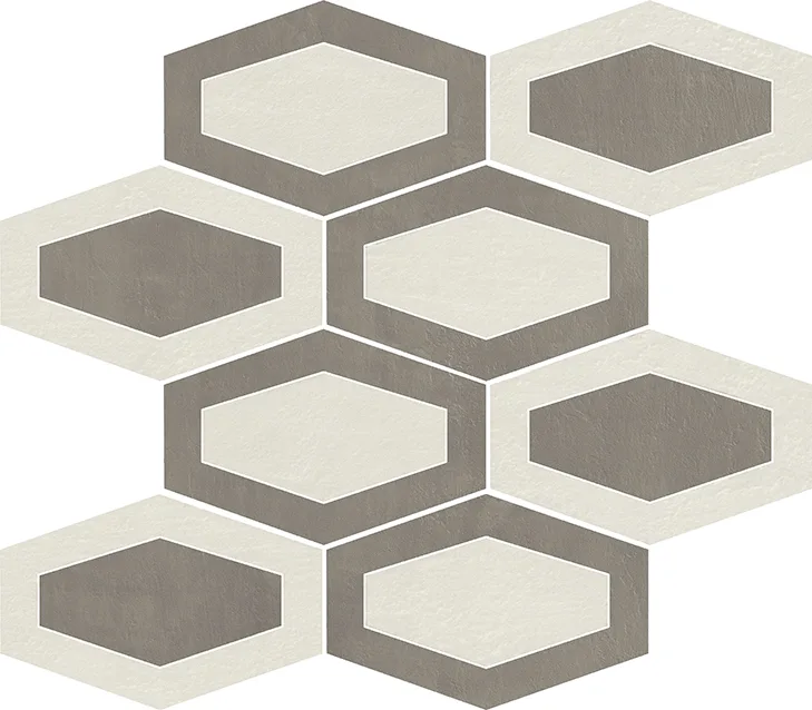 Listello Metal 5×30 (2"x12"), Mosaico 2.5×7.5 su rete 30×30 (12"x12"), Mosaico 5×5 su rete 30×30 (12"x12"), Mosaico Esagono su rete 30×26 (12"x10.4"), Mosaico Metal su rete 26.1×26.1 (10.3"x10.3")