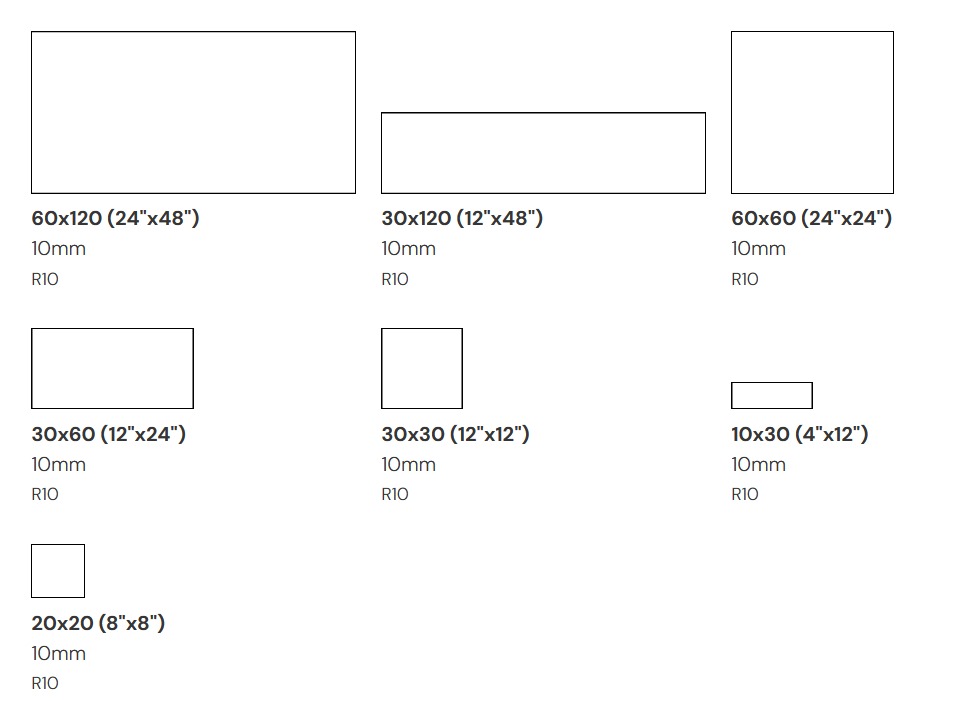10×30 (4"x12") 10mm R10, 20×20 (8"x8") 10mm R10, 30×120 (12"x48") 10mm R10, 30×30 (12"x12") 10mm R10, 30×60 (12"x24") 10mm R10, 60×120 (24"x48") 10mm R10, 60×60 (24"x24") 10mm R10