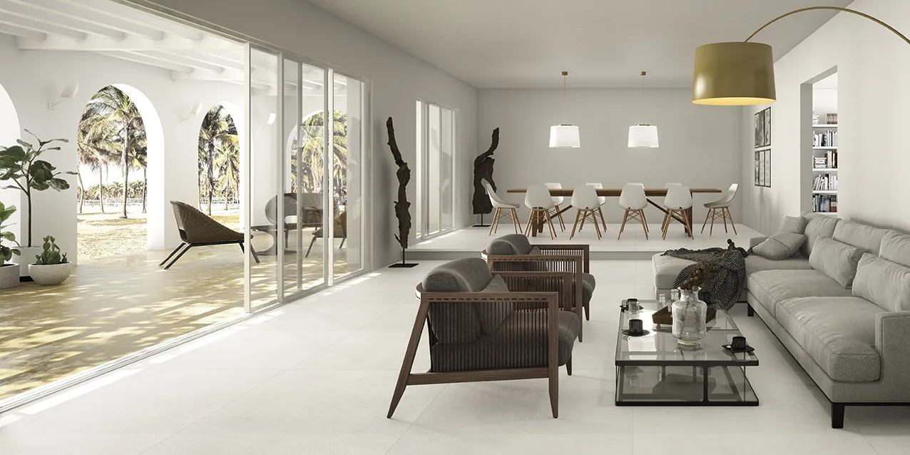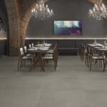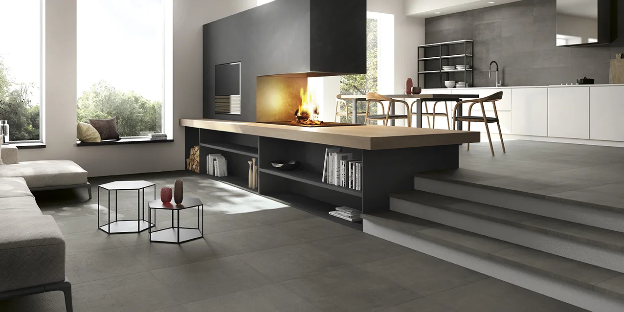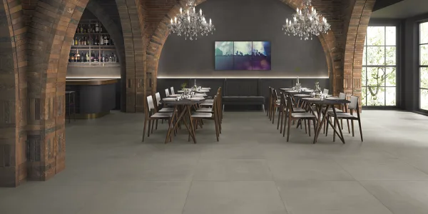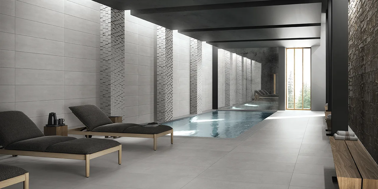 • Combine larger formats for continuity (e.g. 60×120, 30×120) to reduce joints and enhance the industrial feel.