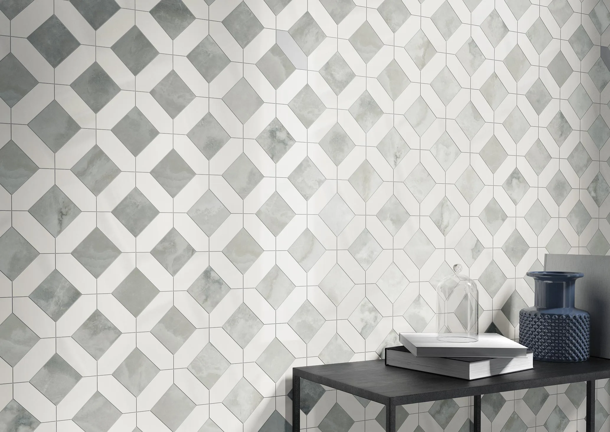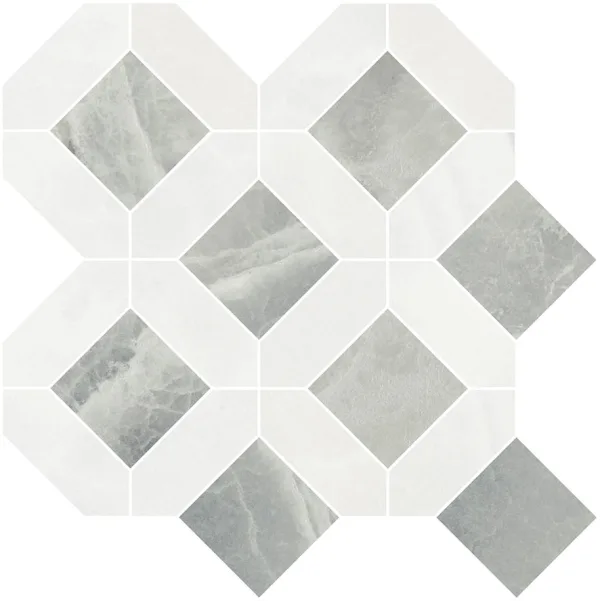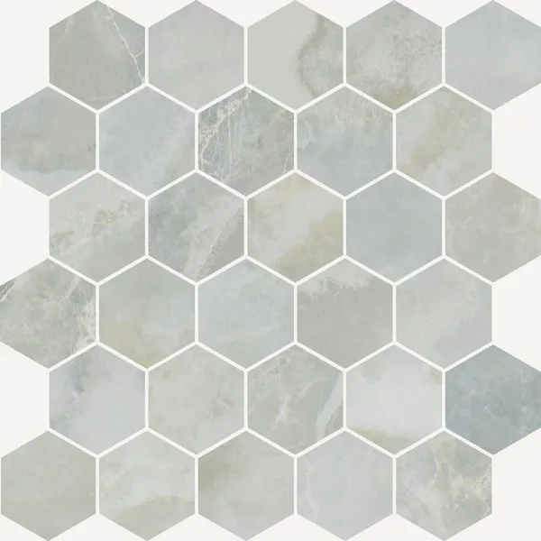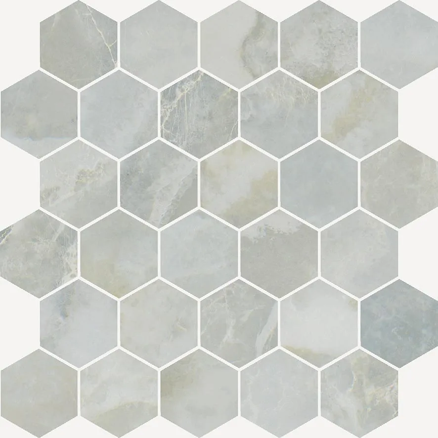 Mosaico 5×5 su rete 30×30 (12"x12"), Mosaico Antique Lux su rete 30×30 (12"x12"), Mosaico Esagono su rete 27×28 (10.5"x11"), Mosaico HB su rete 28×32 (11"x13")