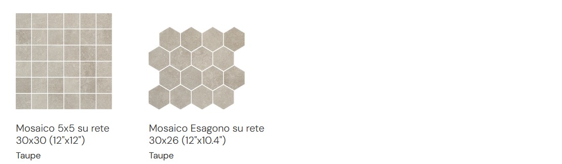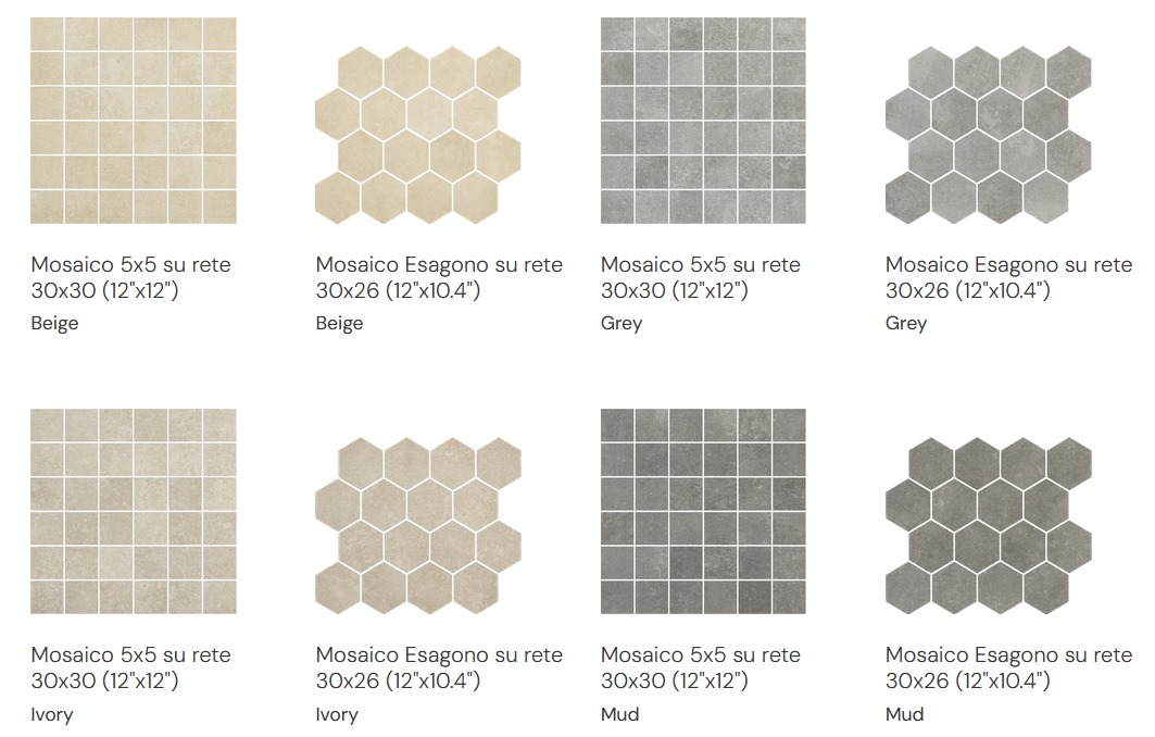 | Decors | Mosaico 5×5 su rete 30×30 (12"x12"), Mosaico Esagono su rete 30×26 (12"x10.4") |