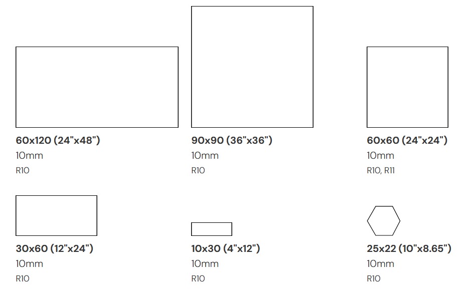 | Size | 10×30 (4"x12") 10mm R10, 25×22 (10"x8.65") 10mm R10, 30×60 (12"x24") 10mm R10, 60×120 (24"x48") 10mm R10, 60×60 (24"x24") 10mm R10, R11, 90×90 (36"x36") 10mm R10 |