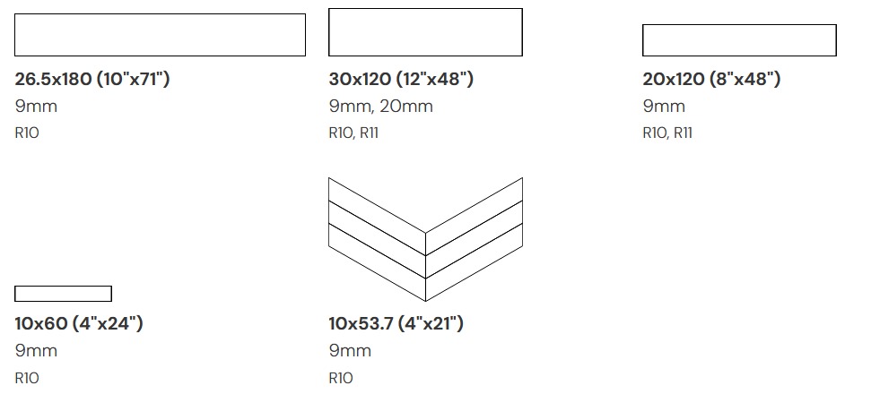| Size | 10×53.7 (4"x21") 9mm R10, 10×60 (4"x24") 9mm R10, 20×120 (8"x48") 9mm R10, R11, 26.5×180 (10"x71") 9mm R10, 30×120 (12"x48") 9mm, 20mm R10, R11 |