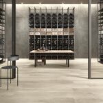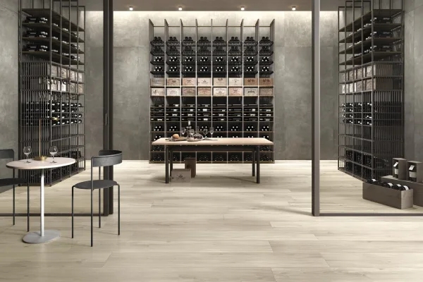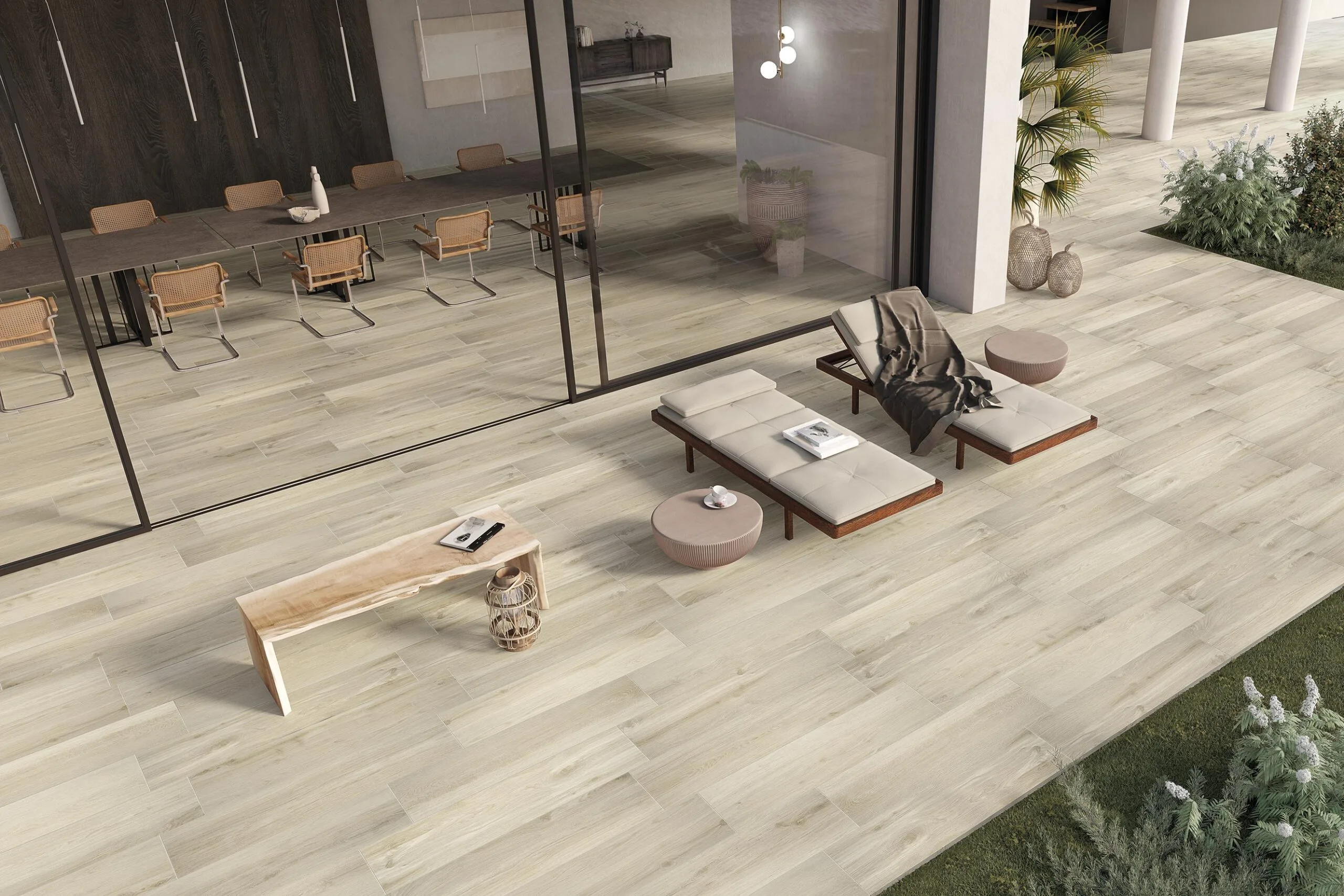 Wood‑look aesthetic: “Il calore del legno incontra i vantaggi del grès porcellanato” — the warmth of wood meets the advantages of porcelain stoneware.