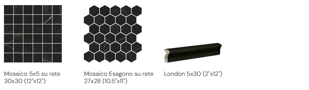 Decorative formats including: Mosaic 5×5 cm sheet on 30×30 cm mesh, Hexagon 27×28 cm mesh mounted, London strip 5×30 cm.