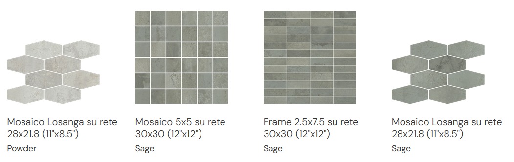 Brick-mosaic and leaf-mosaic formats in the same palette create visual interest and can anchor feature zones.
