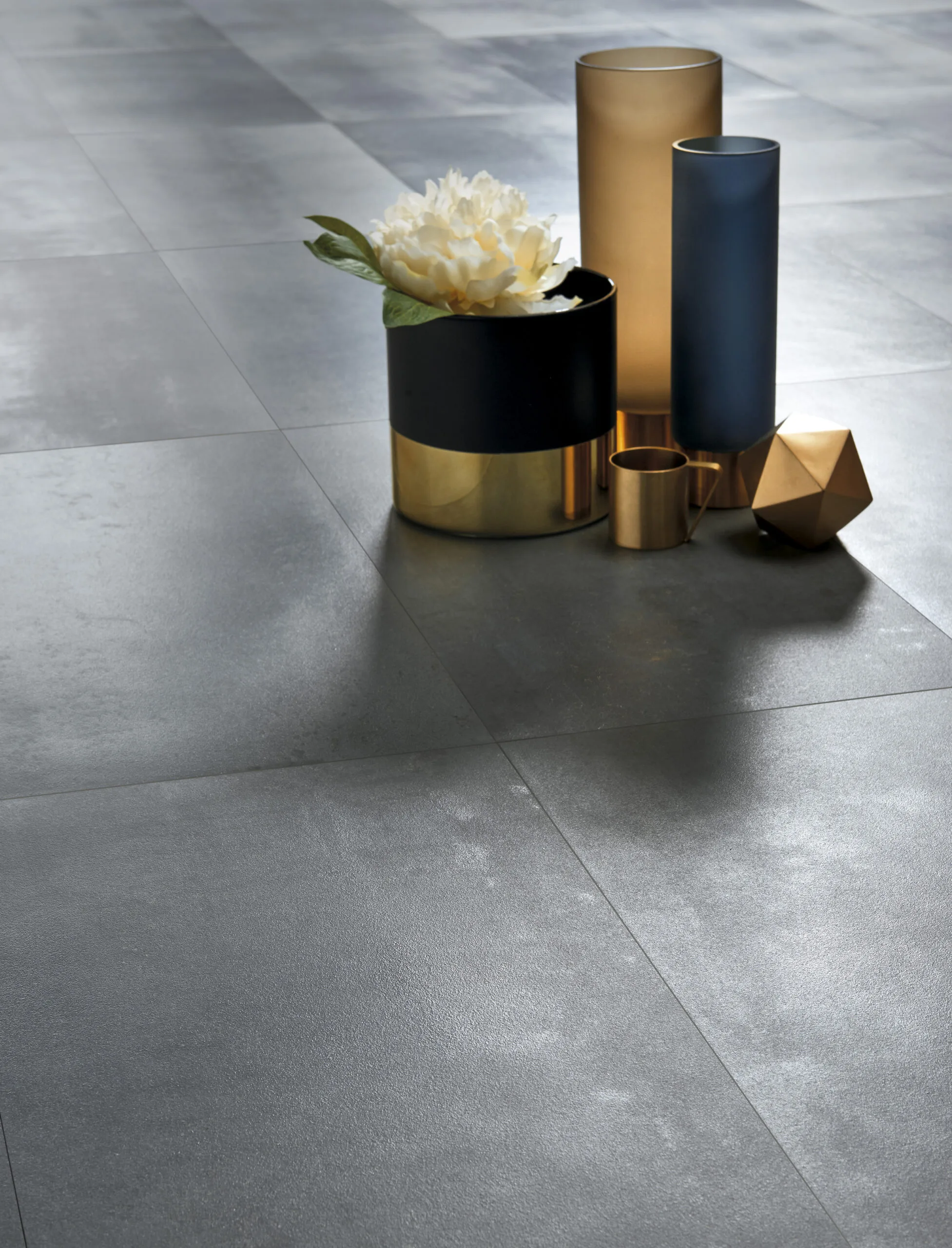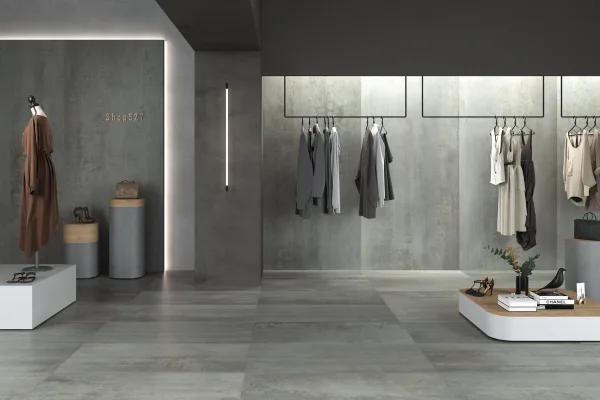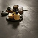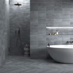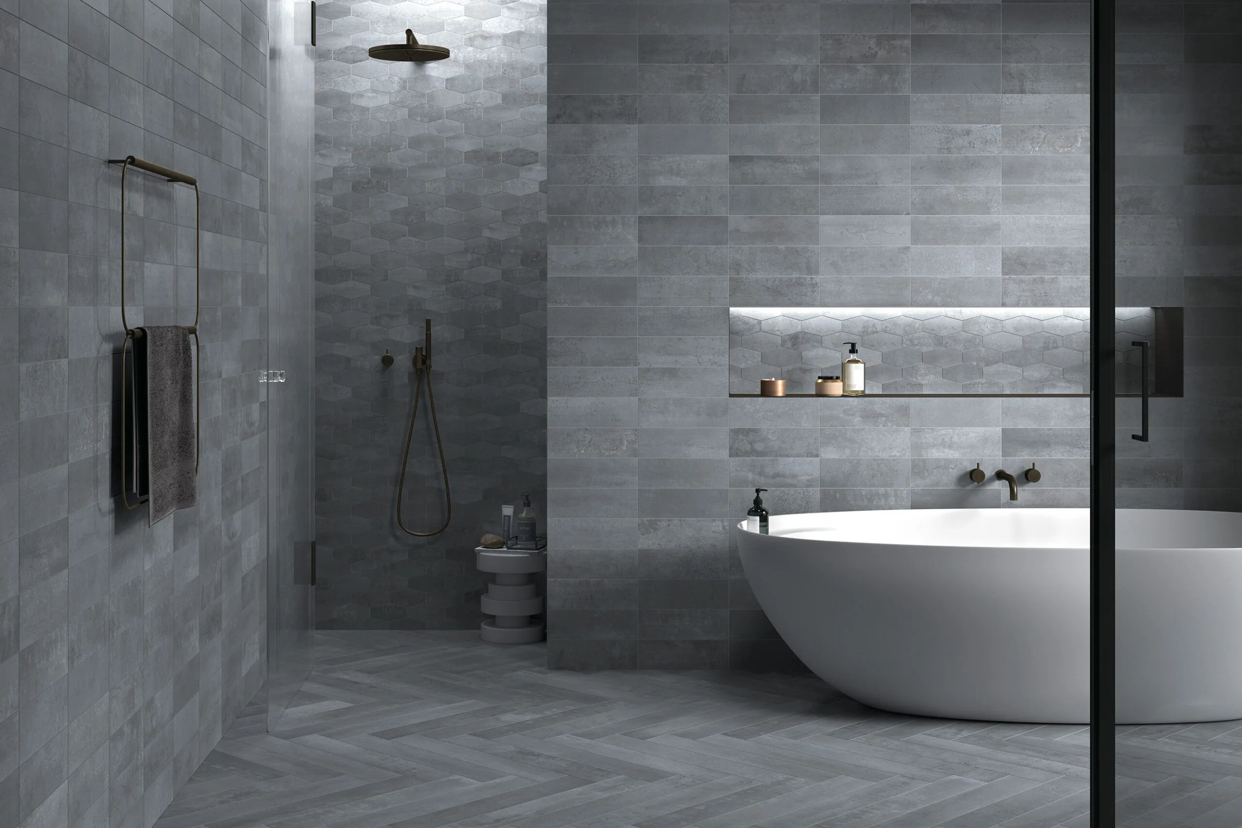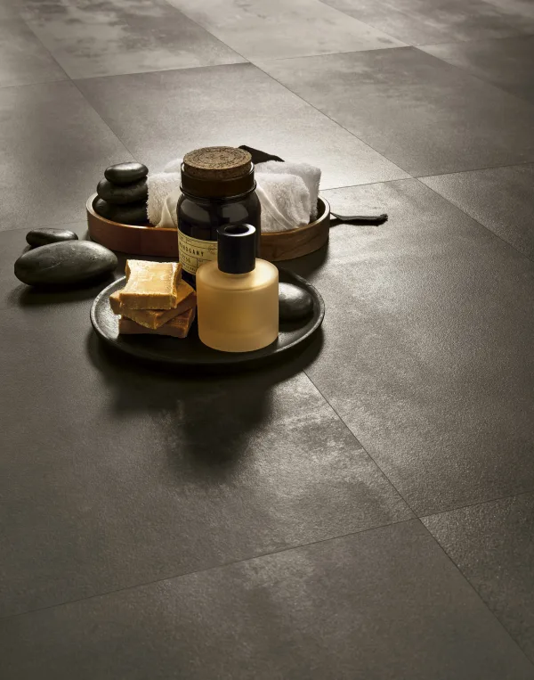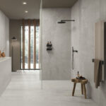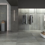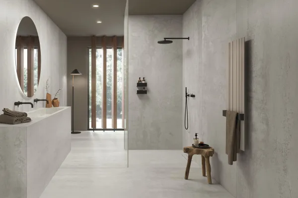 Imagine your bathroom floor laid with the 60 × 120 cm “Powder” tone tile: the finish gives a discreet steel/industrial feel, yet the matt surface keeps it warm and spa-like. On one bathroom wall behind a freestanding bath, install the “Blu” tone in the same series but in a vertical 30 × 120 cm format to draw the eye upwards. Use a 5 × 20 cm accent strip in “Bronze” as a border or niche frame. Finish with matte black hardware and subtle lighting to bring out the metallic textures. The result: an elegant bathroom that feels engineered yet inviting.