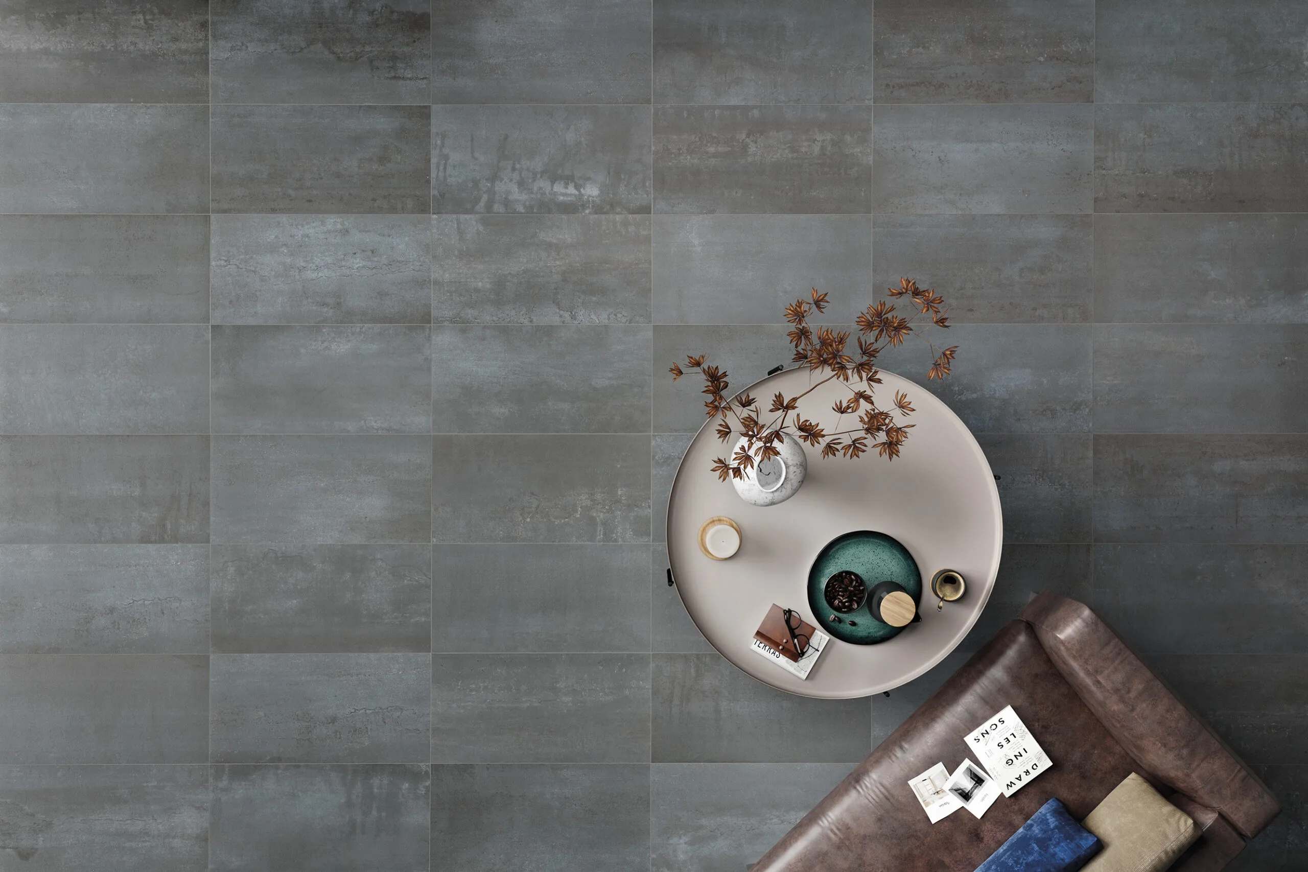 The look is inspired by aged metal plates — think oxidation marks, subtle patinas, and textured surfaces that give depth and character.