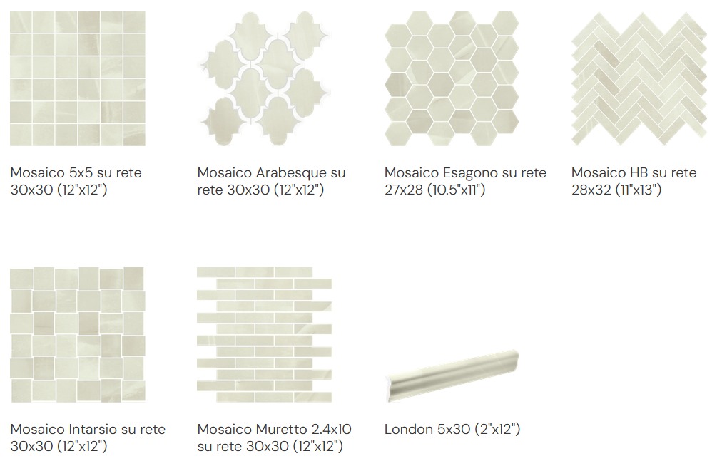 | Decors | London 5×30 (2"x12"), Mosaico 5×5 su rete 30×30 (12"x12"), Mosaico Arabesque su rete 30×30 (12"x12"), Mosaico Esagono su rete 27×28 (10.5"x11"), Mosaico HB su rete 28×32 (11"x13"), Mosaico Intarsio su rete 30×30 (12"x12"), Mosaico Muretto 2.4×10 su rete 30×30 (12"x12") |