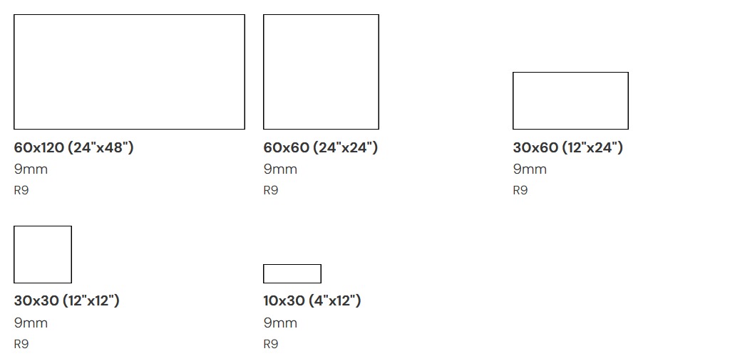 | Size | 10×30 (4"x12") 9mm R9, 30×30 (12"x12") 9mm R9, 30×60 (12"x24") 9mm R9, 60×120 (24"x48") 9mm R9, 60×60 (24"x24") 9mm R9 |