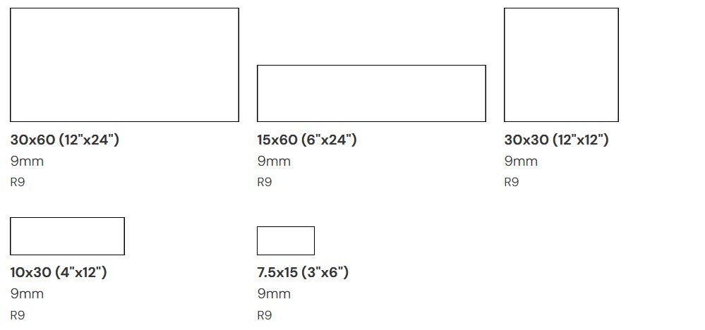 Available in a variety of formats including 15×15 cm, 30×30 cm, 30×60 cm, 60×60 cm.