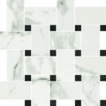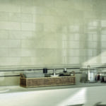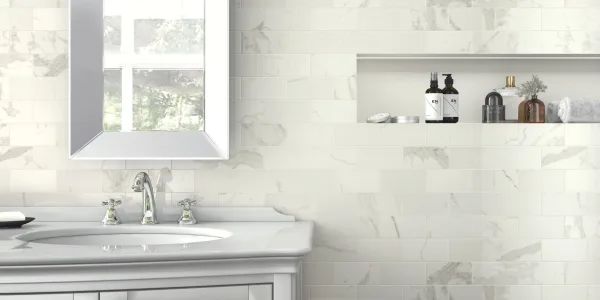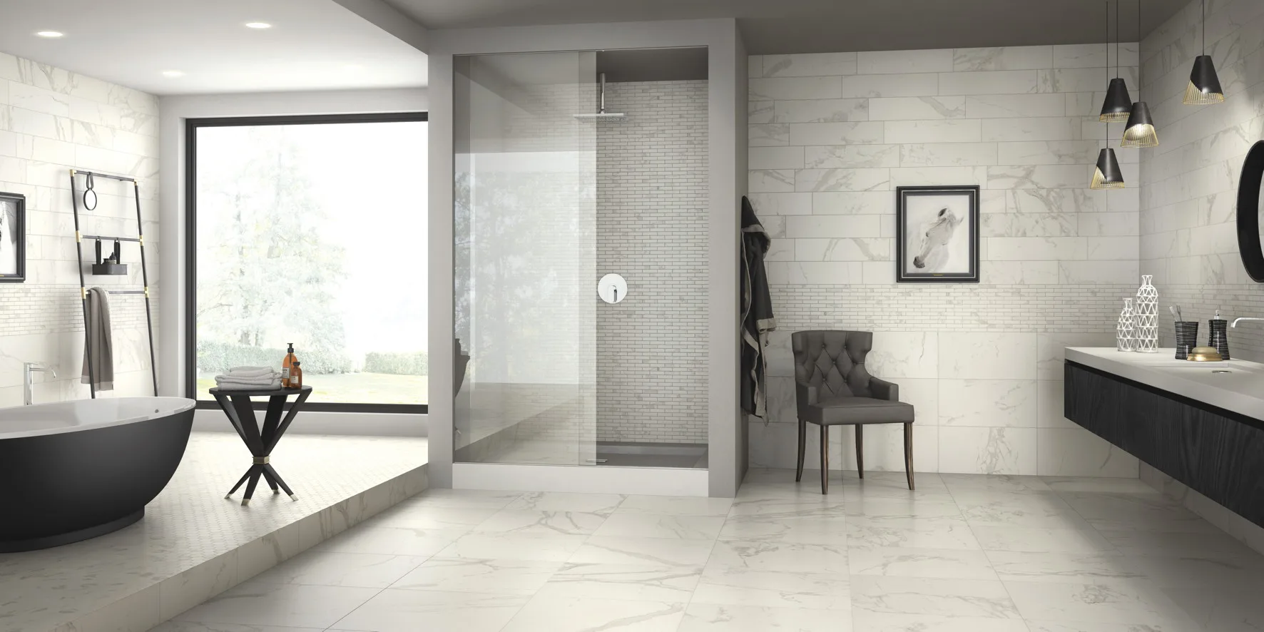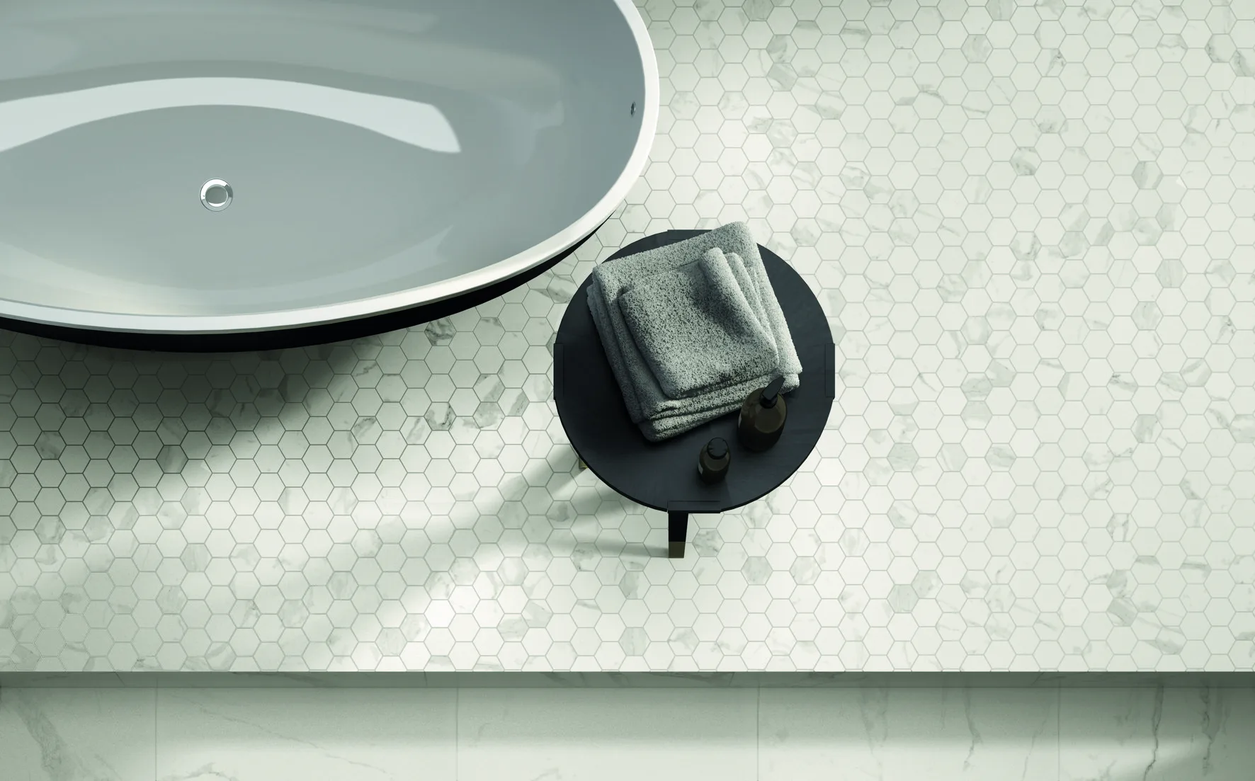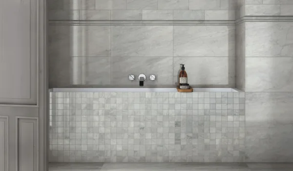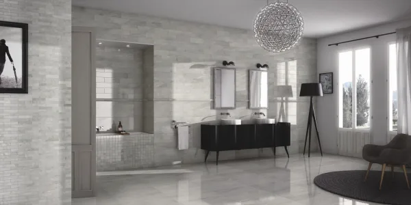 For a feature aesthetic: use the tiles behind your bath or vanity to make the veining and glossy surface the visual focal point.