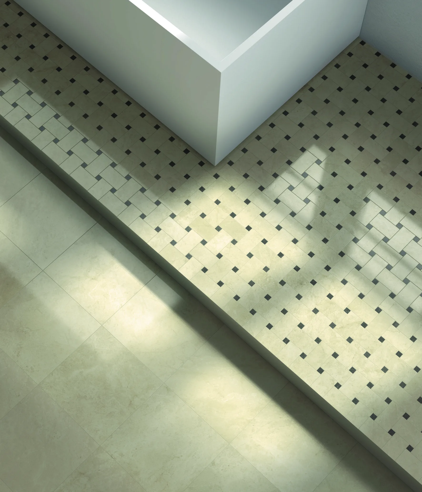 Use the collection for major surfaces like walls or floors to create a clean luxurious foundation.