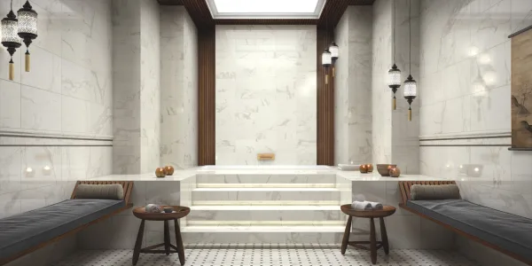 For a spa-like retreat: carry the 60×60 cm (or 30×60 cm) format across floor and wall to create visual continuity and maximise light reflection.
