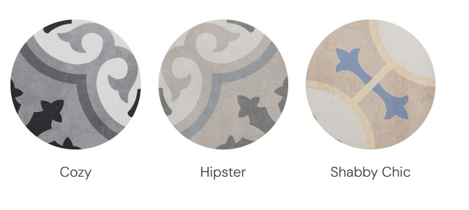 The collection features themed sub-styles such as Cozy, Hipster, and Shabby Chic, offering varying pattern moods from softly aged to boldly graphic.