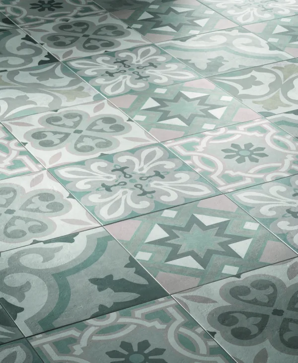 Each tile comes in a 20 × 20 cm (8″×8″) format, which makes it ideal for creating patterned floors or decorative wall zones.