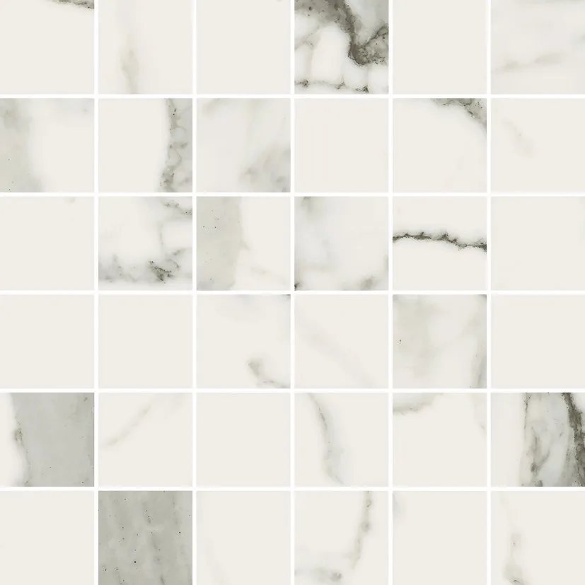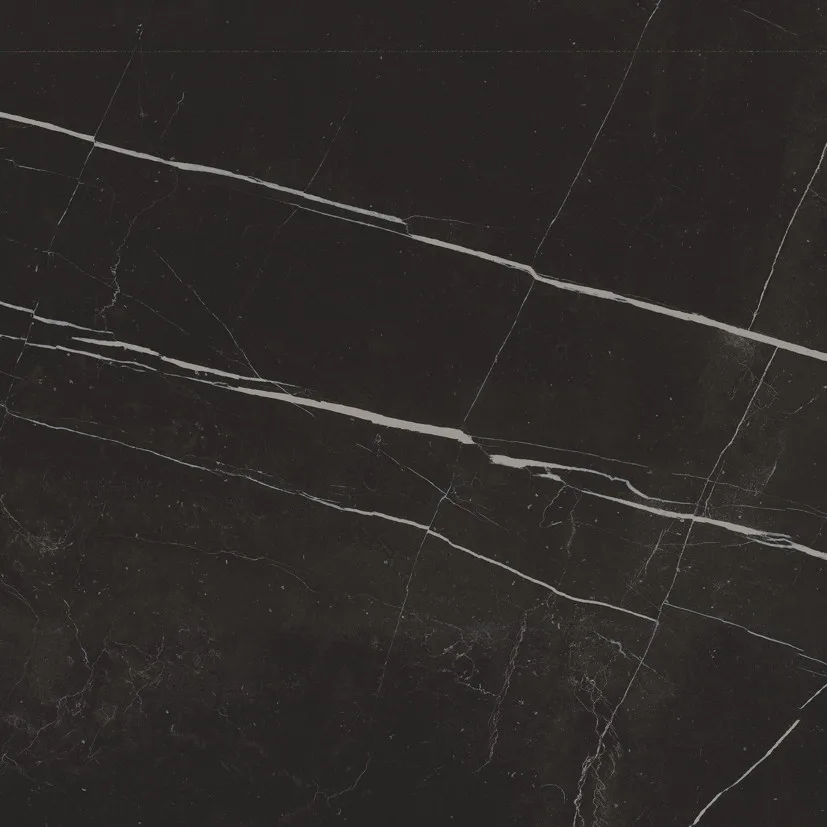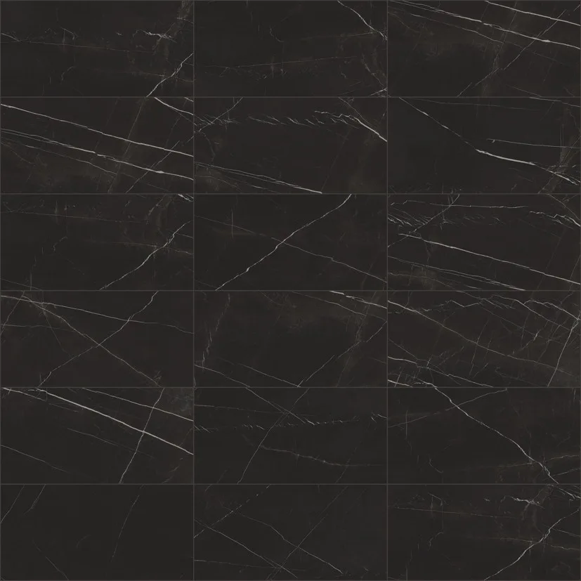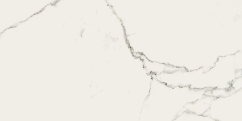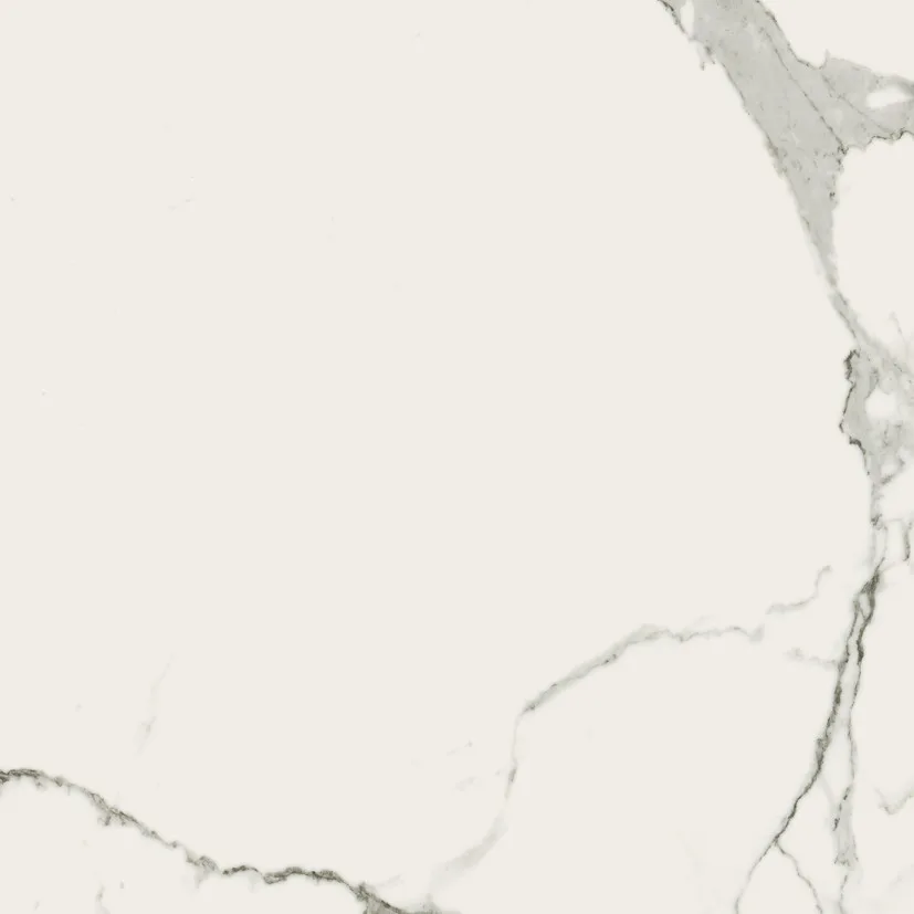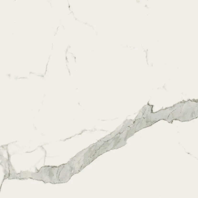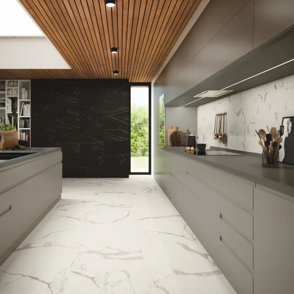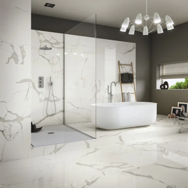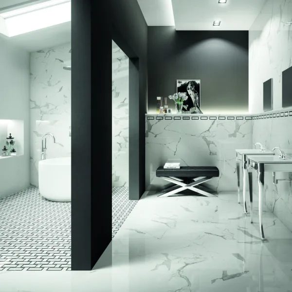 Use the large 120×120 cm or 60×120 cm formats on the floor for minimal joints and a continuous marble-look effect.
