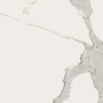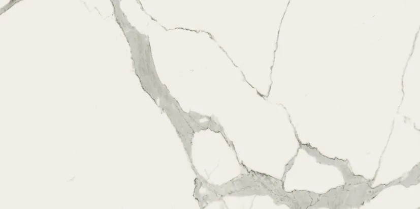 The core tone is a crisp white base with strong grey veining reminiscent of high-end marble — making it bold yet neutral enough to pair with many design directions.