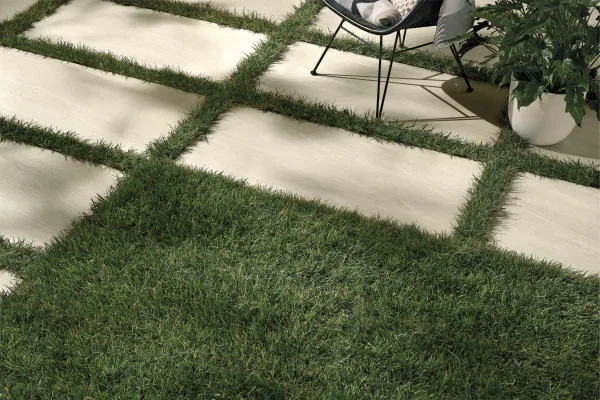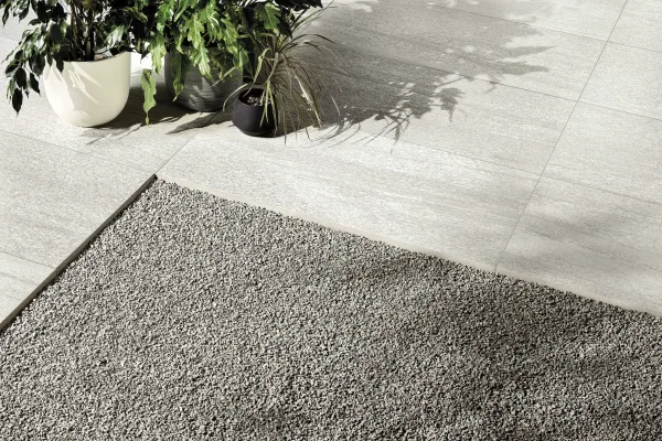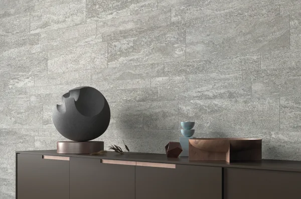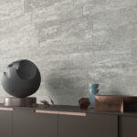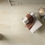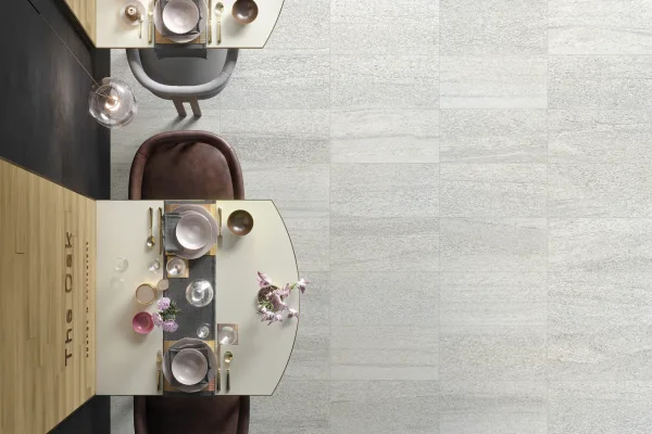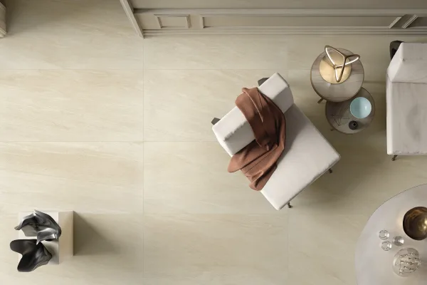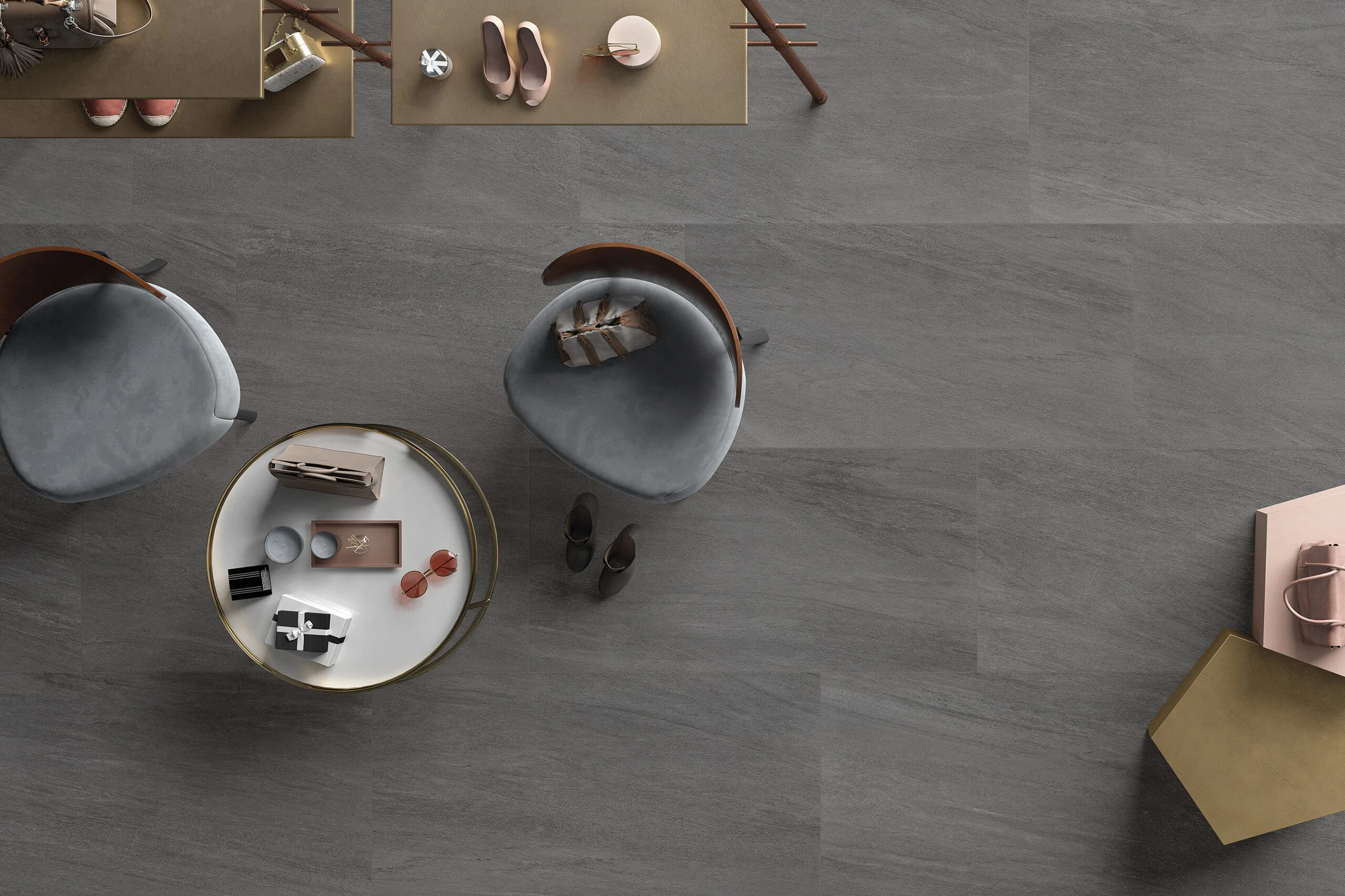 Use the large 60×120 cm format on the floor for a sweeping effect with minimal joints.