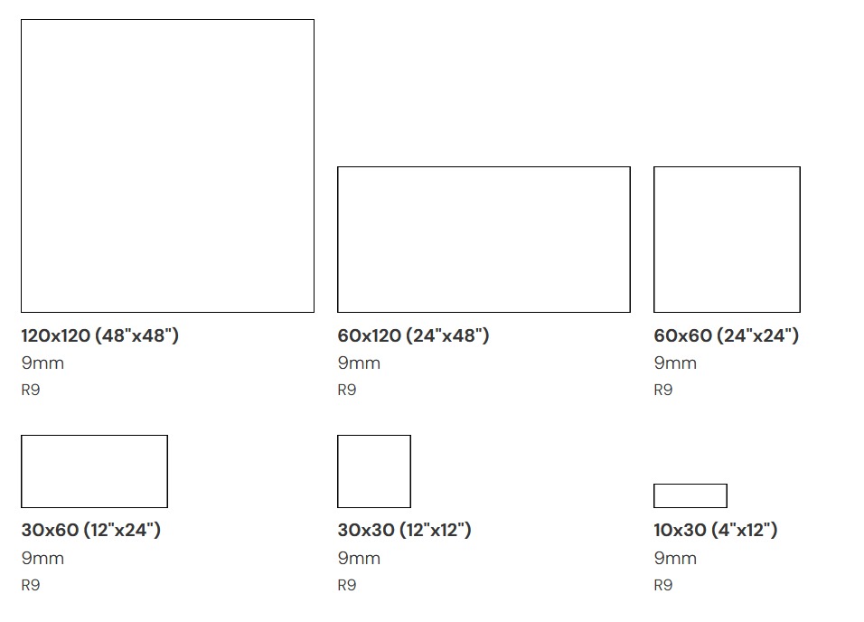 120 × 120 cm (48″×48″), 9 mm thickness, R9 slip rating
